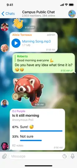Telegram — облачный мессенджер, его можно использовать одновременно на нескольких устройствах, и все чаты и файлы (за исключением секретных чатов) будут доступны на этих устройствах. Во всех чатах можно использовать голосовые сообщения, видеосообщения, прикрепление файлов, стикеры, gif-анимации и эмодзи; есть отметка о том, что собеседник прочитал сообщение и т. д. А среди основных особенностей мессенджера можно выделить следующие: