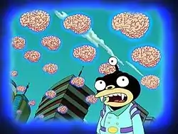На Землю с планеты Твинис-12 прилетают ужасные огромные летающие мозги — мозголи. Они подавляют все мысли и делают всех разумных существ на Земле гораздо тупее (кроме Фрая).