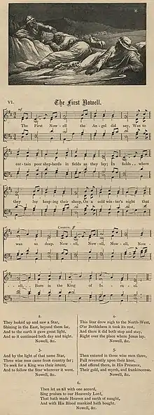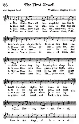 - The First Nowell, Hymns and Carols of Christmas. «carol of the 16th or 17th century, but possibly dating from as early as the 13th Century.» Barrie Jones (ed.), The Hutchinson Concise Dictionary of Music, Routledge, 2014, s.v. «carol», «Christmas carols were common as early as the 15th century. […] Many carols, such as 'God Rest You Merry Gentlemen' and 'The First Noel', date from the 16th century or earlier.»