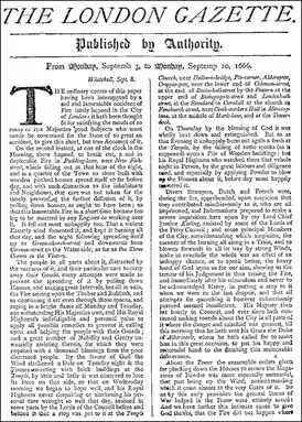 ![]() Первая полоса номера от 3—10 сентября 1666 года. Заметка сообщает о грандиозном пожаре в Лондоне | |