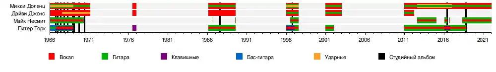 - Майкл Несмит — соло-гитара, клавишные, бэк и ведущий вокал (1966—1970, 1986, 1989, 1996—1997, 2012—2014, 2016, 2018—2021; умер в 2021)