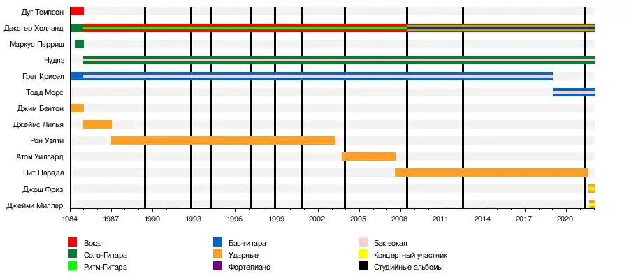 - Грег Крисел (Greg Kriesel) — бас-гитара, бэк-вокал (1984-2018)
