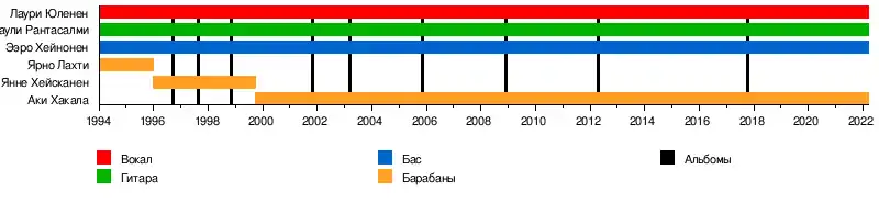 - Ээро Хейнонен — бас-гитара, бэк-вокал (1994 — настоящее время)