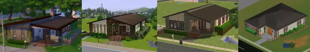 Сравнительная демонстрация возможностей реактора строительства в The Sims 4 (2014), The Sims 3 (2009), The Sims 2 (2004) и The Sims (2000). Здания в игре намеренно создавались подобными друг другу и демонстрируют совершенствование редактора строительства и то, как они вместе с каждой новой игрой позволяют подробнее настраивать архитектурные детали | ||||||||||
