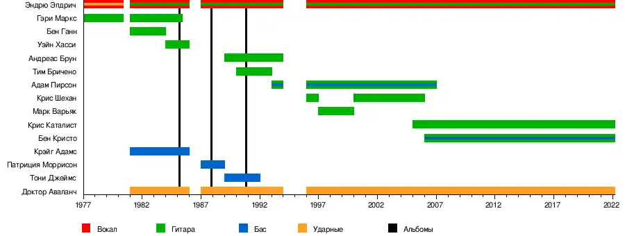 - Эндрю Элдрич — вокал, клавишные, гитара, драм-машина (1977—1980, 1981—1985, 1987—1993, 1995—наши дни)