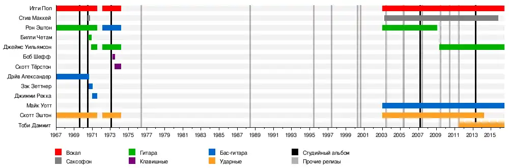 - Игги Поп — ведущий вокал (1967—1974, 2003—2016)