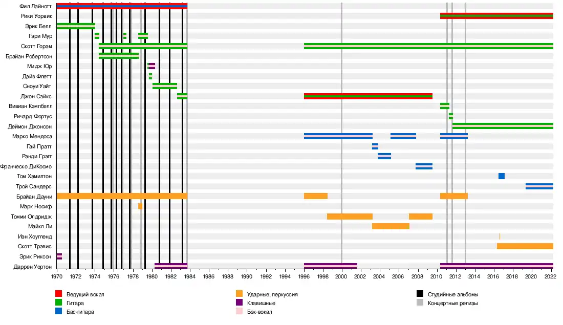 - Фил Лайнотт — вокал, бас-гитара, гитара (1969—1983; умер в 1986)