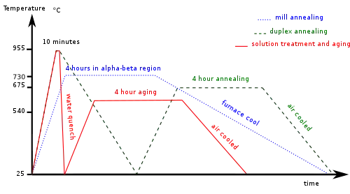 Ti-6Al-4V подвергается термообработке для изменения количества и микроструктуры и фазы в сплаве. Микроструктура будет значительно различаться в зависимости от точной термической обработки и метода обработки. Три распространенных процесса термообработки - это прокатный отжиг, дуплексный отжиг и обработка на твердый раствор и старение[13].