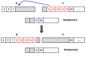 - Меньший из подмассивов копируется во временный массив