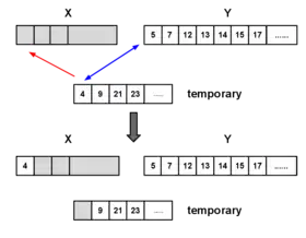 - На каждом следующем шаге рассматривается значение текущих элементов в большем и временном массивах, берётся меньший (больший) из них и копируется в новый отсортированный массив. Указатель текущего элемента перемещается в массиве, из которого был взят элемент.