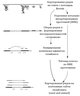 TopHat идентифицирует все канонические сайты доноров и акцепторов (динуклеотиды «GT-AG», «GC-AG» и «AT-AC») внутри «островков» (в обратных цепях тоже). Затем алгоритм рассматривает те пары сайтов донор-акцептор соседних, но не обязательно ближайших друг к другу, «островков», между которыми можно найти последовательности потенциальных канонических интронов. Далее TopHat ищет среди ННК прочтений те, которые охватывают места стыка экзона и интрона, и картирует их по принципу seed-and-extend. По умолчанию программа рассматривает потенциальные интроны длиной от 70 до 20 000 нуклеотидов[1].