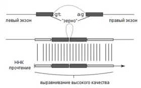 - Картирование ННК прочтений по возможным границам экзонов (seed-and-extend).