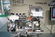 Электромотор, генератор и бензиновый двигатель соединялись друг с другом с помощью планетарного редуктора. Водило редуктора присоединялось непосредственно к двигателю, передавая вращение на наружное зубчатое колесо и внутреннюю солнечную шестерню через шестерни-сателлиты. Наружное колесо редуктора соединялось в электромотором и, одновременно, через цепную передачу передавало вращение на колёса автомобиля, когда как внутренняя солнечная шестерня с помощью отдельного вала приводила во вращение генератор[39]. Добиваясь максимальной эффективности работы каждого двигателя, система управления автоматически выбирала режим движения или на электромоторе, или с помощью бензинового двигателя, или их обоих[40].