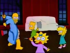 Барт и Лиза с Мэгги рассказывают страшилки, а Гомер подслушивает их рассказы.
