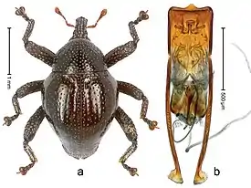 ![]() Долгоносик Trigonopterus kalimantanensis и гениталии, шкала = 1,0 и 0,5 мм | ||||||