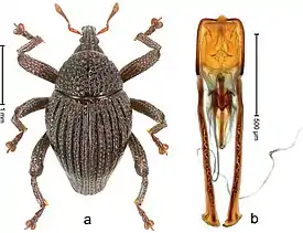![]() Долгоносик Trigonopterus kintamanensis и гениталии, шкала = 1,0 и 0,5 мм | ||||||||