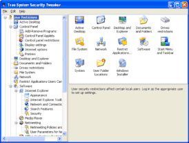 По утверждению разработчика на официальном сайте твикер способен не только тщательно настроить параметры и оптимизировать систему, но и сделать работу за компьютером более безопасной. True System Security Tweaker способен управлять доступом пользователей к разнообразным элементам, таким, как Панель управления, Рабочий стол, установленными принтерами или программами. Интерфейс программы сконструирован в виде проводника Windows, в левой части окна находится дерево объектов с категориями для удобной и быстрой навигации, которое позволяет без труда изменить любую из 470 предлагаемых настроек операционной системы.