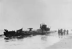 ![]() U-20 на датском побережье в 1916 году. Торпеды взорвались в носовой части, уничтожив корабль | |