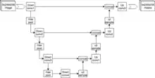 Сеть содержит сверточную (слева) и разверточную части (справа), поэтому архитектура похожа на букву U, что и отражено в названии. На каждом шаге количество каналов признаков удваивается.