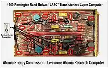 Первый LARC был поставлен в Ливерморскую лабораторию с опозданием на три года, с перерасходом бюджета в несколько раз и финансовым убытком для UNIVAC/Remington-Rand. Например, для борьбы с паразитными шумами, возникавшими при сбросе паразитных токов с шин на корпус, весь корпус и места контактов шин с корпусов было решено покрыть золотом, а контакты на самом шасси - серебром.[3] LARC был построен на базе поверхностно-барьерных транзисторов, которые вышли из употребления к тому моменту, когда машина была завершена. Тем не менее производительность LARC соответствовала заявке Лаборатории.