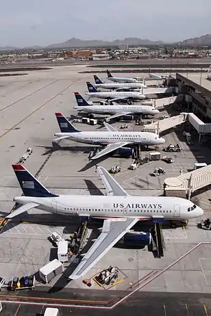 US Airways использовала в качестве главных хабов международные аэропорты в Шарлотте/Дуглас, Филадельфии и Финикс Скай Харборе, а также международные аэропорты в Вашингтоне (имени Рональда Рейгана), Лас-Вегасе (Маккаран), Нью-Йорке (Ла Гардиа) и Бостоне (Логан) — в качестве своих дополнительных хабов[2].
