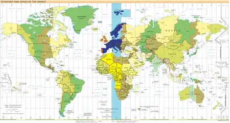 голубым — зона UTC+1 в океанах;