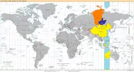 ярко-жёлтым — круглогодичная зона UTC+8 (иркутское и пекинское время);