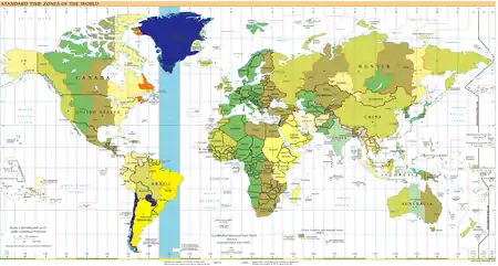 синим — зона UTC−3 зимой (ноябрь-март) в Северном полушарии (летом (апрель-октябрь) — UTC−2) и зона UTC−3 летом (ноябрь-март) в Южном полушарии (зимой (апрель-октябрь) — UTC−4) ;