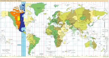 оранжевым — зона UTC−6 летом (апрель-октябрь) в Северном полушарии и зона UTC−6 зимой (апрель-октябрь) в Южном полушарии