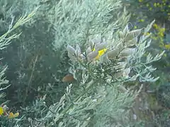 Цветки собраны в короткие кисти и сидят на опушённых цветоножках 2—3 мм длиной. Цветки 7—11 мм длиной. Чашечка желтоватая, 4—9 мм длиной, серебристо-опушённая. Венчик жёлтый, мотыльковый, киль опушённый сзади.
