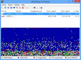 UltraDefrag — утилита для дефрагментации дисков. Имеет компактный размер, портативную версию, а также отдельные установщики для платформ x86/x64. Оснащен движком, который может работать как в графическом режиме, так и в режиме консоли. Поддерживает Lua-скрипты, а также работу по расписанию. Результат отчёта генерирует в формате HTML.