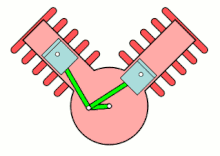 V-образная схема двигателя — схема расположения цилиндров поршневого двигателя внутреннего сгорания, при которой цилиндры размещаются друг напротив друга под углом от 10° до 180° (наиболее часто 45°, 60° и 90°; V-образный двигатель с развалом 180° следует отличать от оппозитного двигателя) в форме латинской буквы «V». В настоящее время в автомобилях чаще всего встречаются конфигурации с 6, 8, в спортивных моделях с 10 и 12 цилиндрами. В мотоциклах — с 2, 4, в спортивных моделях с 5, 6 цилиндрами. В авиационных или корабельных двигателях — с 4, 5, 10, 12 или более цилиндрами. Позволяет сократить линейные размеры мотора по сравнению с рядным расположением цилиндров.
