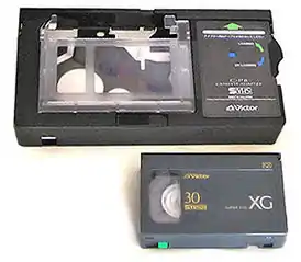 ![]() Видеокассета формата VHS-C (снизу) и адаптер для неё (сверху) | |
