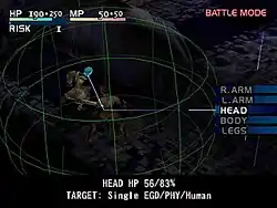 Встреченные в отдельных комнатах противники перемещаются в реальном времени и могут свободно атаковать Эшли; как правило, комнату нельзя покинуть, не уничтожив всех противников в ней. Боевая система Vagrant Story имеет сходство с другой игрой Square — Parasite Eve[14]. Хотя бой проходит в реальном времени, нажатием определённой кнопки игрок может приостановить игру для атаки. При этом вокруг героя появляется сфера поражения — она соответствует длине оружия, которым в текущий момент вооружён персонаж. У короткого оружия, такого как кинжалы или короткие мечи, радиус сферы очень мал, но скорость атаки выше, чем у алебард или арбалетов. Если внутрь сферы поражения попадает какая-либо из частей тела противника, по ней можно нанести удар. У многих противников одни части тела более уязвимы для определённых видов оружия и определённых способностей, чем другие, так что победа над тем или иным врагом часто представляет собой тактическую головоломку[11].