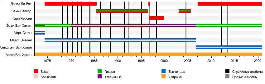Алекс Ван Хален Эдди Ван Хален Марк Стоун Дэвид Ли Рот Майкл Энтони Сэмми Хагар Гэри Чероне Вольфганг Ван Хален |