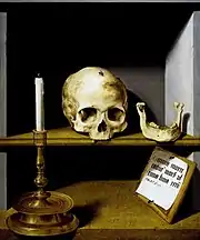 - Череп — напоминание о неизбежности смерти. Практически обязательный атрибут натюрморта этого жанра[2]. Аналогично тому, как портрет является лишь отражением когда-то живого человека, так и череп является лишь формой когда-то живой головы. Зритель должен воспринимать его как «отражение», он наиболее отчетливо символизирует бренность человеческой жизни[3].