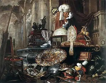 Очень редко натюрморты этого жанра включают человеческие фигуры, иногда скелет — персонификацию смерти[14]. Объекты часто изображаются в беспорядке, символизируя ниспровержение достижений, которые они обозначают.