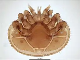 ![]() Клещ Varroa jacobsoni (вид снизу) | ||||||||||