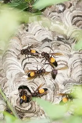 V. affinis, как правило, строят свои гнёзда на ветках деревьев, а также на кустарниках, чердаках и крышах домов, под карнизами зданий, прикрепленных к стенам виноградным лозам, внутри сараев и хозяйственных построек. Зрелые гнёзда обычно имеют внутри от четырёх до десяти ярусов и 800—1500 ячеек. Рекордное по числу ячеек крупное гнездо было найдено в тропиках на Новой Гинее (в нём было 12 ярусов и 45 тысяч ячеек), а в субтропиках — на Тайване (более 6 тысяч ячеек). Общий размер достигает в отдельных случаях до 1 м. По высоте гнёзда располагаются от уровня почвы до 26 м в Сингапуре (но обычно ниже 17 м). На Суматре отдельные гнёзда находили на деревьях на высоте до 30 м[1][2]. Кроме того, есть отличия гнездостроения в разных регионах и местах расположения. В южных тропических областях вершина гнёзда очень узкая, расширяется вниз, образуя грушевидную или каплевидную структуру. Гнёзда в субтропических регионах обычно овальные с округлой вершиной. Гнёзда, построенные на высоких деревьях, как правило, вытянуты по вертикали. Гнёзда, построенные на малой высоте, внизу или на небольших деревьях или зданиях, обычно остаются круглым и не достигают больших размеров[6].