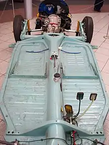 Основой автомобиля являлось несущее днище, в заднюю часть которого был встроен двигатель, объединённый с коробкой передач. Внутри центральной балки проходили все тяги и кабели, необходимые для управления двигателем, трансмиссией и тормозами, а также топливный трубопровод от расположенного спереди бензобака. Сваренный из металлических штампованных деталей двухдверный кузов устанавливался сверху и привинчивался к днищу, добавляя жёсткости всей конструкции[60].