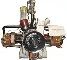 За задней осью автомобиля располагался четырёхцилиндровый бензиновый оппозитный двигатель, в котором пары цилиндров были расположены напротив друг друга (оппозитно). Каждый цилиндр был выполнен отдельно, изготовлен из алюминиевого сплава с чугунной гильзой внутри и имел оребрение для лучшего охлаждения. Пара цилиндров накрывалась головкой, в которой располагались клапаны и коромысла, приводимые толкателями от расположенного в картере из магниевого сплава распредвала (OHV). Снаружи цилиндры были закрыты кожухом с вентилятором, который подавал воздух для охлаждения двигателя[80].