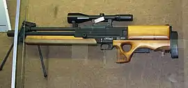 - Приклад: выполненный по схеме «Буллпап» из дерева, пластика или лёгкого металла.