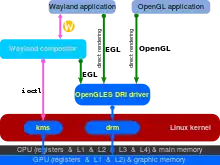 Wayland использует уже существующие в ядре Linux технологии, такие как Kernel mode-setting (KMS), Direct Rendering Manager (DRM) и Graphics Execution Manager (GEM).