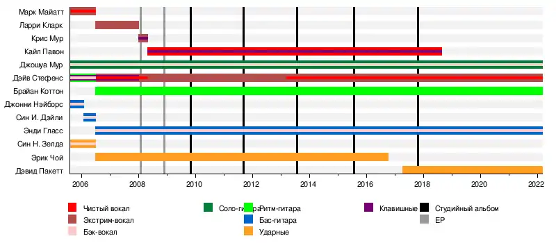 - Кайл Павон — чистый вокал, клавишные (2008-2018; умер в 2018)