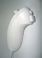 Нунчак (модель RVL-004) — это игровой контроллер, подключающийся к Wiimote через порт расширения проводом длиной 1-1,2 метра. Контроллер имеет аналоговый стик и две кнопки. Как и Wiimote, Nunchuk имеет датчик-акселерометр. Во многих играх Wiimote и Nunchuk используются совместно.