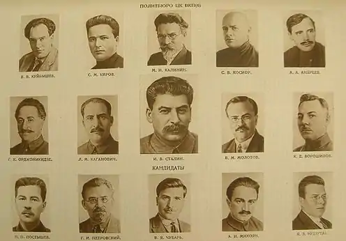 ![]() В президиуме XVII съезда. В. М. Молотов, И. В. Сталин, А. Н. Поскрёбышев. |