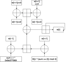 - Константа δ, выведенная из Золотого сечения δ = ( — 1) * 231 = 2654435769 = 9E3779B9h[3], умножается на номер цикла(это было сделано для предотвращения простых атак, основанных на симметрии раундов).
