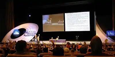 Голосование по принятию проекта проходило на пленарном заседании Ассамблеи во второй половине дня. После возврата к правилам, установленным 15 августа, каждый отдельный член МАС, присутствующий на Ассамблее, имел право голоса. Пленарное заседание проходило под руководством астронома Джоселин Белл Бернелл.[28] Во время этого заседания члены МАС голосовали по каждой резолюции, поднимая желтые карточки. Команда студентов подсчитывала голоса в каждой секции аудитории, а астроном Вирджиния Тримбл составляла и подсчитывала подсчеты голосов. [29]