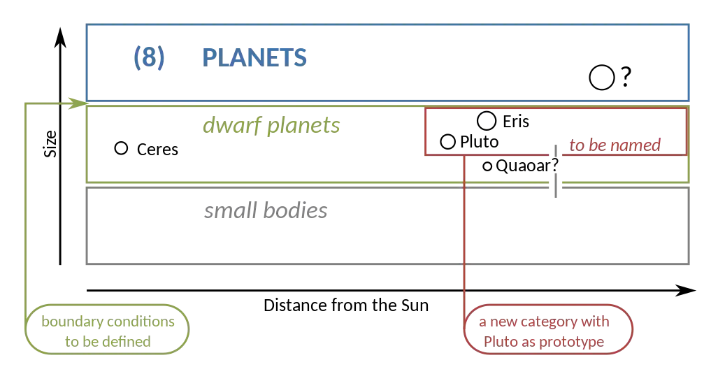 В 2000-е годы было открыто несколько крупных, сопоставимых по размеру и массе с Плутоном объектов: Квавар, Макемаке, Хаумеа, Седна и Эрида (последнюю вообще называли десятой планетой). Было принято решение либо сделать эти объекты планетами, либо переклассифицировать их в новую категорию. В 2005 году МАС предложил следующие три варианта того, что стоит считать планетой: