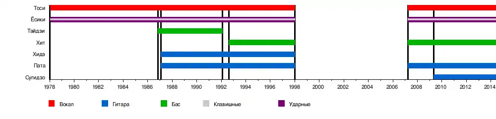 - Ёсики (Yoshiki) (яп. 林佳樹 Хаяси Ёсики) — ударные, клавишные (1982—1997, с 2007)